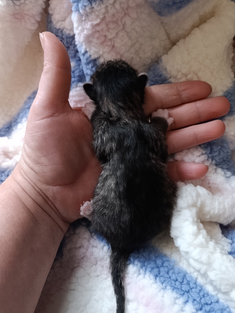 Koťátko narozené nalezené kočičce Cher 17.4.2026 ihned první den po umístění zubožené kočičce. Pohlaví zatím nevíme.