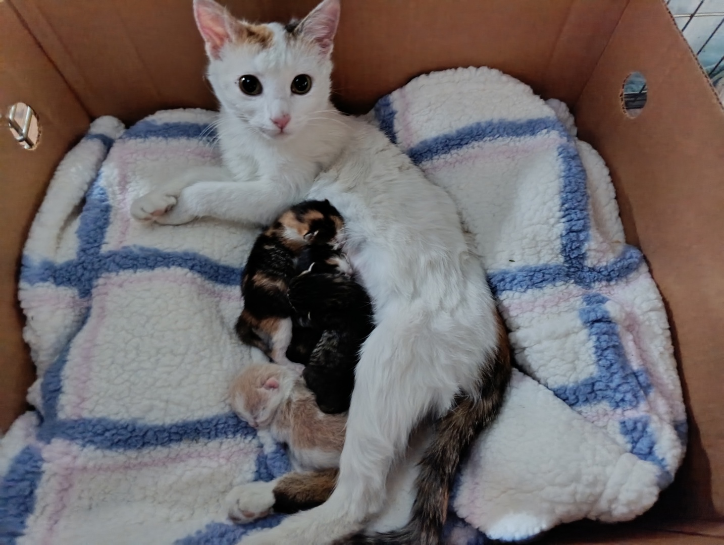 Cher byla nalezena těsně před porodem na soukromém pozemku. Byla převezena k nám, kde ještě ten den porodila 4 koťátka. Maminka byla celá vyděšená a špinavá od bláta. Po 3 dnech kdy zjistila, že je v bezpečí, se zklidnila a je z ní velká mazlinka a vzorná pečovatelka.