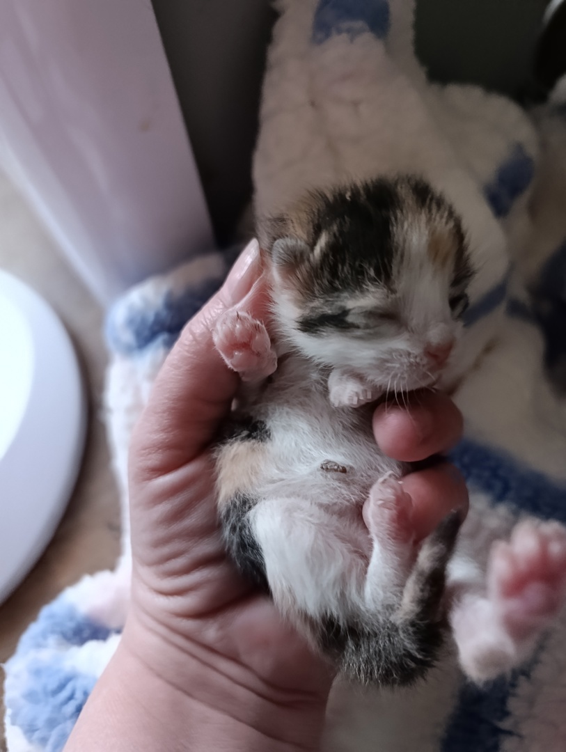 Koťátko narozené nalezené kočičce Cher 17.4.2026 ihned první den po umístění zubožené kočičce.